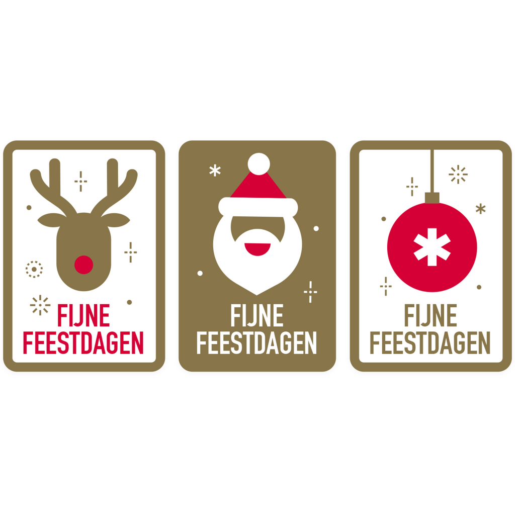 Je kerstcadeautjes krijgen nóg meer sfeer en uitstraling met een leuke kerstdecoratie. Van deze zelfklevende etiketjes van FSC-gecertificeerd papier krijg je meteen drie varianten: mooie rechthoekige stickertjes met sfeervolle kerstafbeeldingen van een rendier, de kerstman en een kerstbal, elk met de tekst Fijne Feestdagen, in de kleuren goud, wit en rood. Ideaal voor een snel feestelijk kerstaccent.